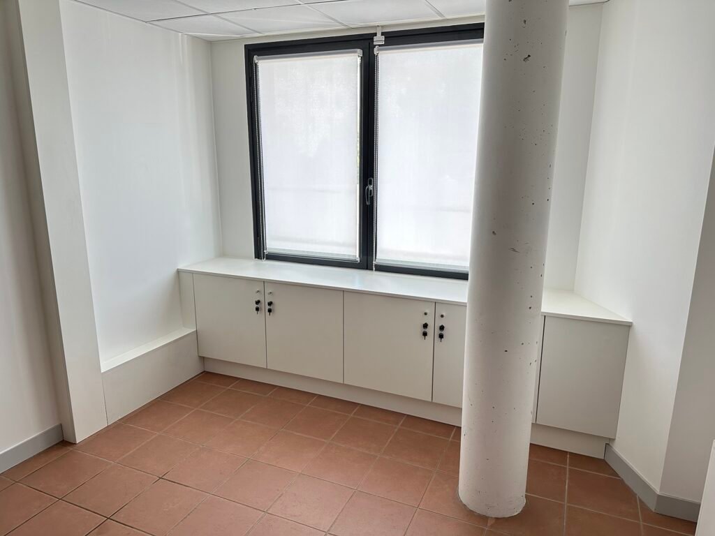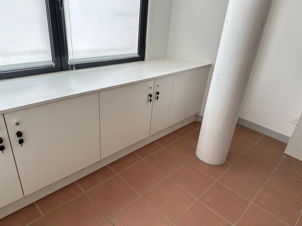 Meuble bas sur mesure créé pour dissimuler des canalisations dans une salle de réunion